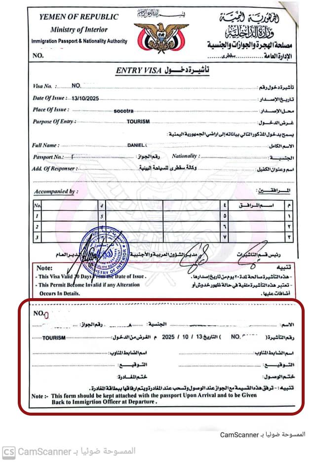 - Canvi de divisa: Es fa el primer dia a Hadibou (a l'aeroport). No us diran el preu del canvi ni res; us heu de fiar d'ells. 1 rial iemenita és igual a 0,0036 EUR (mireu, ja que canvia cada dia). Canvieu poc, només, ja que a molts llocs prefereixen dòlars. A Socotra, la moneda local és el rial iemenita (YER), però els dòlars americans són àmpliament acceptats, especialment per a propines i compres de records. Et suggerim portar bitllets petits i en bon estat. El dirham dels Emirats Àrabs Units (AED) també s'accepta sense problemes, però no te'l recomano. Encara que l'euro és menys comú, també pot ser acceptat.